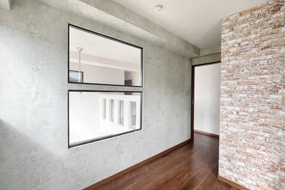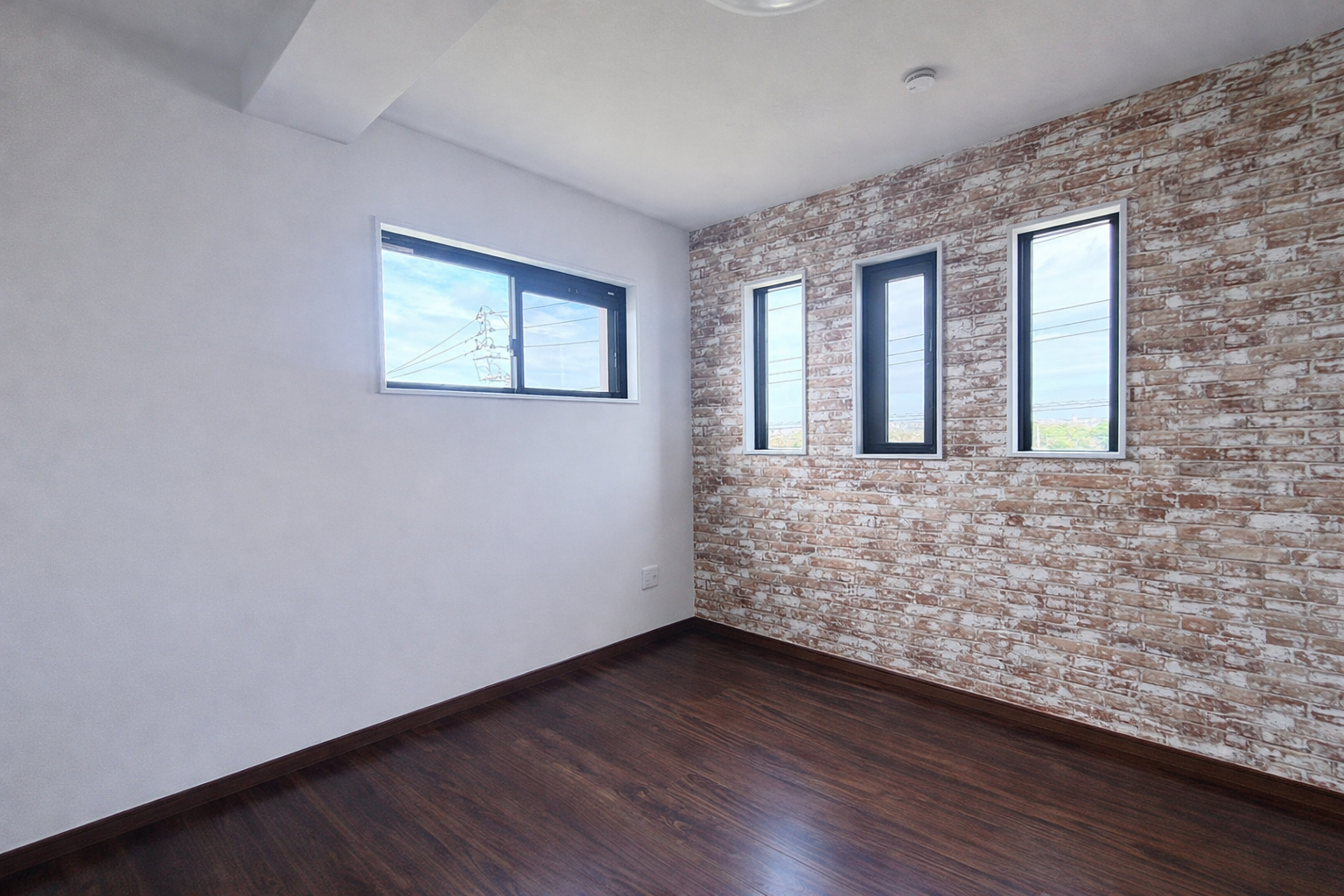 明るい吹き抜けのLDK、アメリカンヴィンテージを思わせるアクセントウォール、水回りは落ち着きのあるシックな仕上がり。